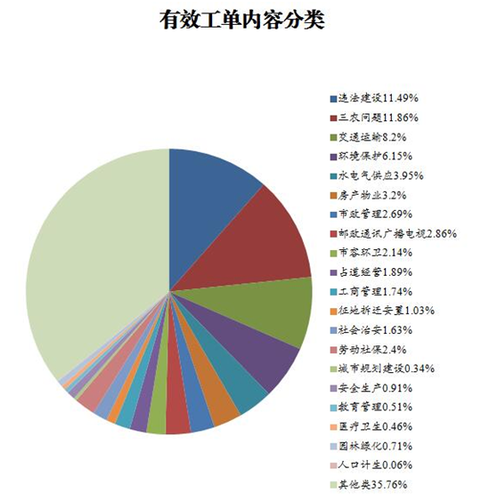 市民来电分类(含省、泰州工单):农业农村农民415件、违法建设402件、交通运输287件、环境保护215件、水电气供应138件、房产物业112件、邮政通讯广播电视100件、市政管理94件、劳动社保84件、市容环卫75件、占道经营66件、工商管理61件、社会治安57件、征地拆迁安置36件、安全生产32件、园林绿化25件、教育管理18件、医疗卫生16件、城市规划建设12件、社会救助救济9件、金融税务8件、文化体育3件、人口计生2件、物价管理2件、其他1229件。